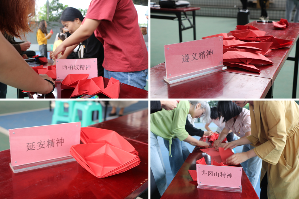 该环节,每组队伍发放 25 张红纸,通过折叠红船,将红船一层一层往上加,以此表达党员在党的领导下汇聚初心、共创美好未来的强大凝聚力,献礼中国共产党百年华诞。从“小小红船”到新时代劈波斩浪的“巍巍巨轮”,体悟开天辟地、披荆斩棘、敢为人先的首创精神。