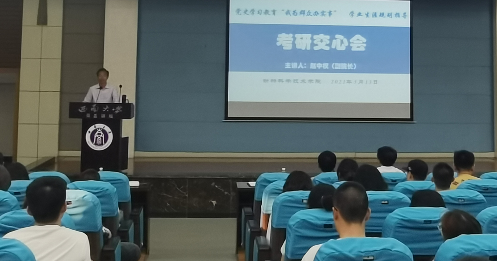 为落实党史学习教育“我为群众办实事”,解决高年级学生学业生涯规划模糊、就业意向不强等问题,5月13日下午,学院在荣昌2211报告厅为2018级学生举行“考研交心会”,交心会由副院长赵中权主讲,党委副书记、纪委书记文武主持。学院党委书记赵智华、2018级辅导员彭香参加会议。