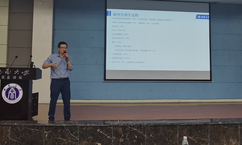 赵中权副院长以动物科学专业学生考研为例,从学院基本情况、学科平台、团队建设及研究生招生等四个方面以长者、导师、领导的身份进行语重心长的交流,在分析目前就业行情基础上,就考研院校、学科方向、学业导师选择等方面给出建议,从学院研究生招生录取角度分享考研成功经验,并给学生详细讲解了研究生招生流程及注意事项。