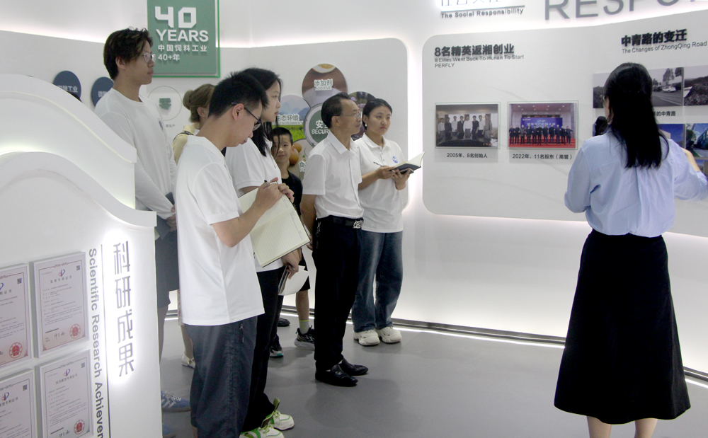 7月10日,实践团抵达江西南昌双胞胎(集团)股份有限公司,先后参观了饲料研发中心和智能猪场,对饲料加工生产和生猪养殖的现代化设备、工艺流程有了清晰直观的认识。通过参观公司历史科技馆,实践团了解到双胞胎集团主动对接国家“乡村振兴战略”,发挥龙头企业和专业合作经济组织的带动作用,以客户为中心,以奋斗者为本,实现当地农业产业发展和农民增收,带动合作农户共同富裕。