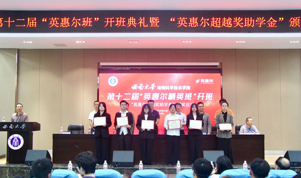 仪式上,赵智华在致辞中表示,希望同学们借助校企合作的良好平台,努力提升适应市场、行业、社会需求的软实力、真本事,成长为高素质的复合人才。赵永聚宣读第十二届“英惠尔班”成员名单。第十二届“英惠尔班”学员代表栗勇涵发言,感谢英惠尔集团对学生们发展的支持和鼓励。许湲宣读2024年英惠尔超越奖助学金获奖名单后,主席台就座的领导嘉宾为获奖学生颁奖。任泽林最后讲话,希望更多同学加入校企合作班,努力学习锻炼,为我国畜牧产业发展做出青春贡献。