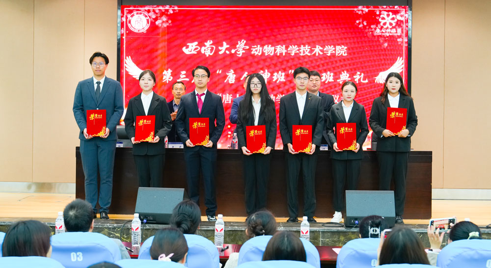 孙海军宣读第三届“唐人神班”学员名单,第三届“唐人神班”学员代表常真珍在发言中表示要传承和发扬“敬业、自责、自信、创新”的唐人神精神,坚定爱农、知农、学农的信心和决心,不断成长为“六有”现代畜牧科技人才。随后,刘金伟宣读“2023-2024学年唐人神奖助学金”获奖名单,主席台就座的嘉宾、领导为获奖学生颁发获奖证书。“唐人神”奖助学金获奖代表杨智代表全体获奖同学郑重承诺,将珍惜这份荣誉,以实际行动回报唐人神集团与学院的厚爱,为推动农牧行业的发展贡献自己的力量。领导、嘉宾为唐人神班班主任、班委颁发了聘书。