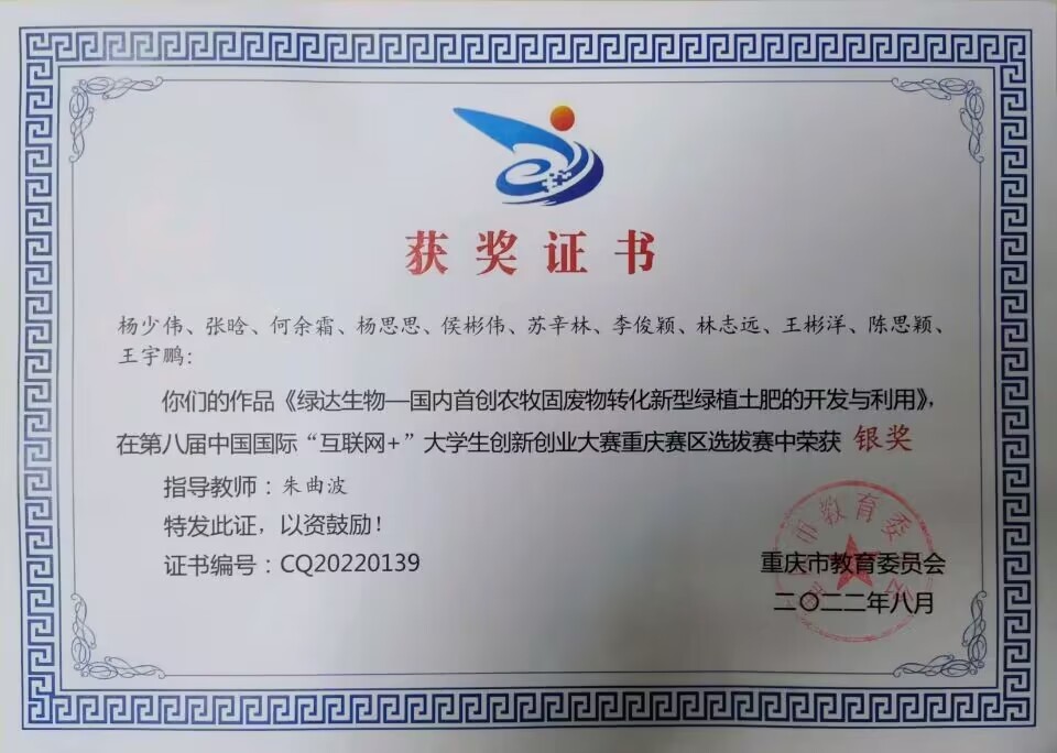 今年5月至8月,重庆赛区举办了第八届中国国际“互联网+”大学生创新创业大赛选拔赛,共吸引了143037个项目参赛,参赛学生657273人次。学院龙昊源等学生在俄广鑫教授指导下完成的《检测速度快、质优价低的猪分子育种 SNP 基因型检测解决方案》,杨少伟等学生在朱曲波副教授指导下完成的《绿达生物——国内首创利用农牧固废物转化新型绿植土肥的开发与利用》分别获得重庆市金奖、银奖。