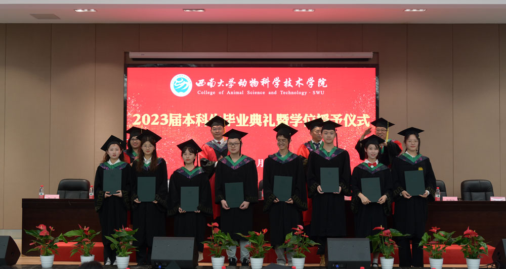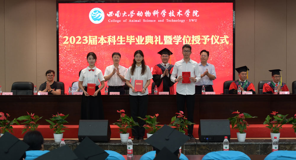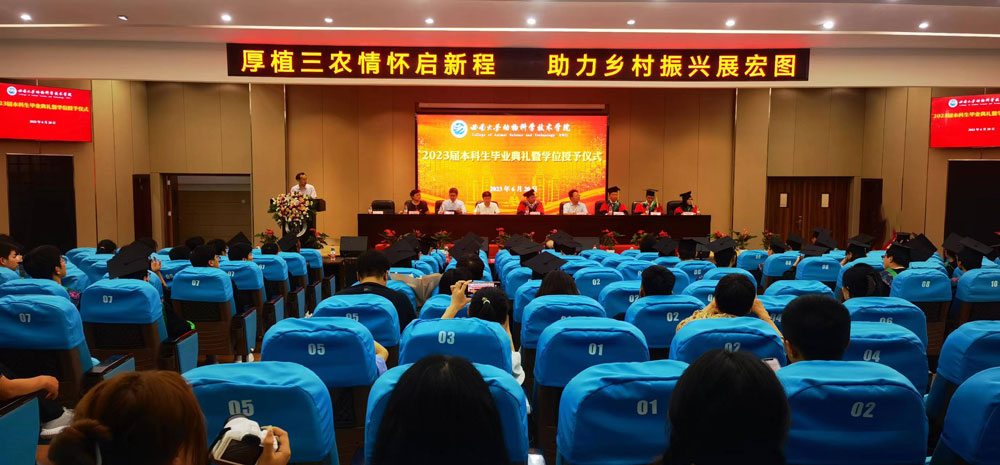 厚植三农情怀启新程,助力乡村振兴展宏图。6月20日下午,学院在荣昌校区2211报告厅举行2023届本科生毕业典礼暨学位授予仪式。学校党委常委、副校长王志坚,学院党委书记赵智华,院长、党委副书记、学术委员会主任赵永聚,副院长向钊、赵中权,优秀校友代表、中国农业科学院饲料研究所二级研究员、动物营养专家、国家生物饲料工程中心主任、北京挑战集团创始人蔡辉益,学院学术委员会副主任、动物生产系系主任刘安芳等出席,学院各系(室、中心)主任、教师代表、辅导员、毕业班班主任、全体在校本科毕业生及家长代表参加。仪式由党委副书记、纪委书记文武主持。