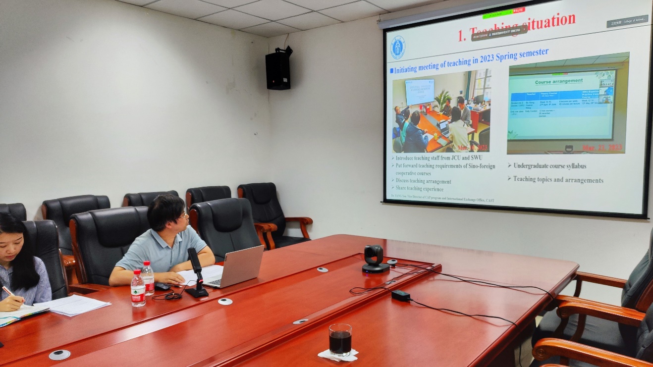 孙雅望就2023-2024年度第一学期JCU来华授课的动物生理学Animal Physiology、动物遗传学Animal Genetics、畜牧微生物Animal Husbandry Microbiology、动物繁殖学Animal Reproduction等课程的教师团队、日程安排等进行了汇报。双方就以上课程的教学模式进行了磋商和讨论。AEMG学术关系部部长陈距女士分别就学术英语教学情况及其2023年赴澳师资培训计划与安排进行了汇报。