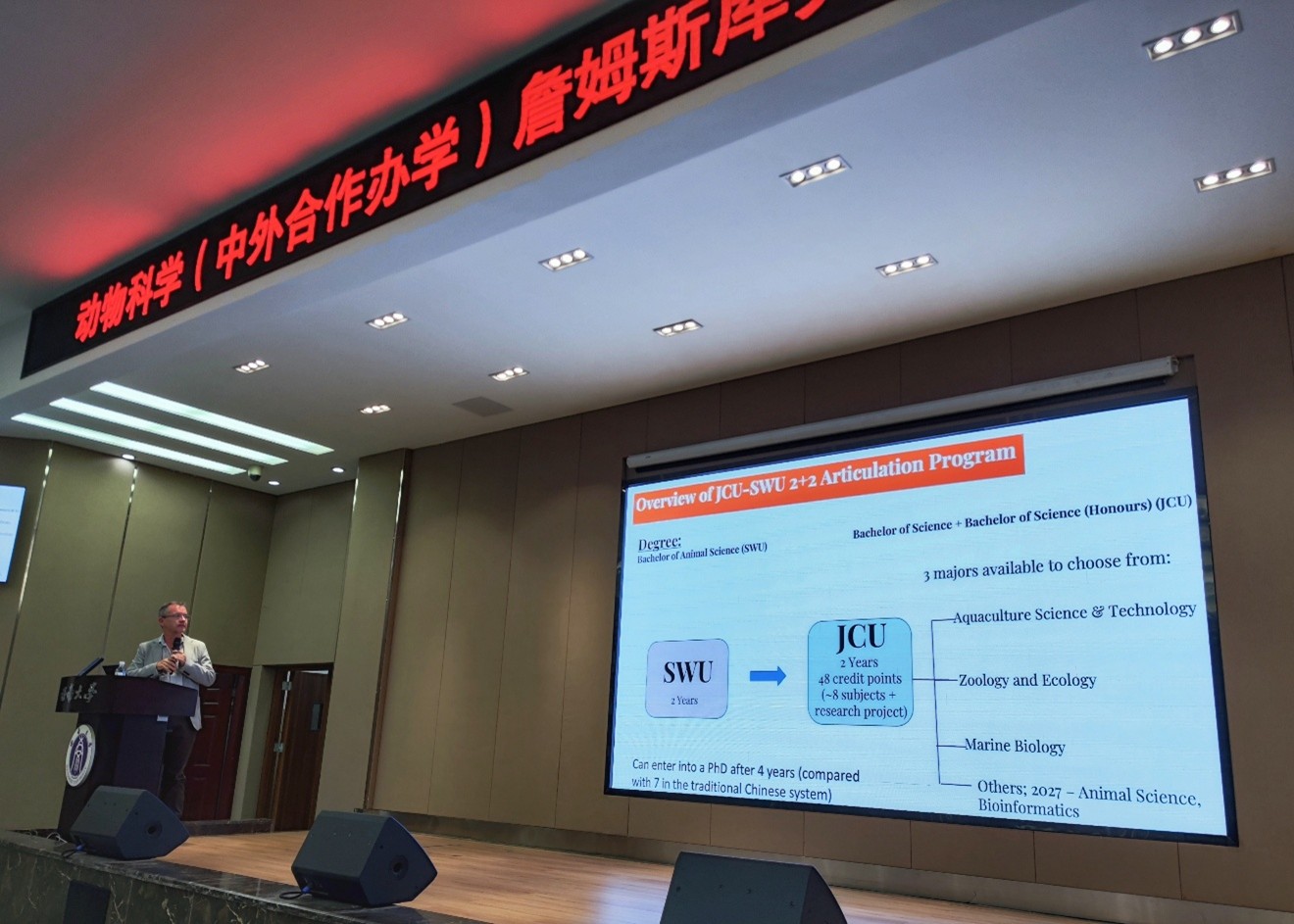 在专业与合作项目介绍环节,Ron White教授详细解读了“2+2”和“3+2”联合培养模式。学生可在水产养殖、动物生态学、海洋生物学、地球环境科学、热带生物与保护等多个方向进行选择,并通过多元化途径实现本-硕-博阶段课程学习与科研实践的有效衔接。