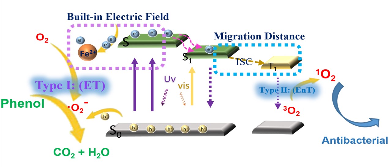 合理设计方案并充分利用太阳能有利于最大限度地发挥光催化材料在环境净化和绿色养殖应用中的潜力。学院动物种质创制与智能畜牧团队苗宏博士与清华大学朱永法教授合作通过微波法制备具有二维结构的酞菁铁有机聚合物(Ex-PcOP-Fe)纳米片(图1),进一步研究发现,Ex-PcOP-Fe中的Fe作为催化活性中心及电子捕获中心,可以提供强大的内置电场,促进了光生载流子的快速分离和迁移(图2)。