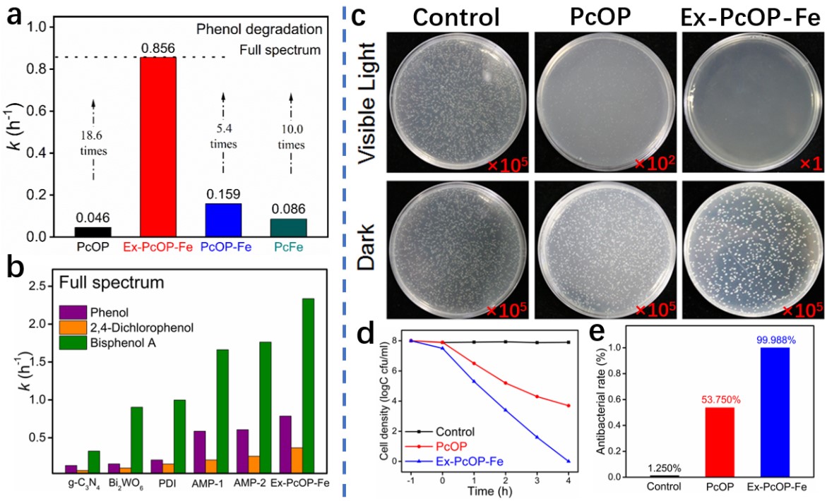 Ex-PcOP-Fe优异的光催化活性可以实现污染物的深度降解和致病菌的高效杀灭。研究发现0.2g/L的催化剂对于10mg/L的苯酚废水的降解速率可达到0.856(图3a)。该光催化剂技术对于其他的有机污染物(双酚A和2,4-二氯酚)同样表现出较好的降解活性(图3b)。除了降解有机污染物,该催化剂同样可以用于养殖污水中致病微生物的杀灭,0.2g/L的催化剂,在4小时内对浓度为109cfu/mL的细菌的灭活效率达99.99%(图3c-e)。