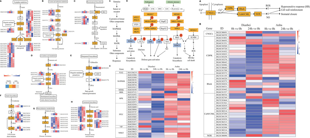 课题组利用转录组学分析了淹水胁迫下,耐涝品种“Dianbei”和涝敏品种“Anba”根系基因的差异表达,发现参与植物激素、MAPK和Ca2+信号转导的DEGs在“Dianbei”和“Anba”中差异表达,推测这些基因和通路的差异表达可能是导致“Dianbei”和“Anba”耐淹能力不同的主要原因。利用转录组和代谢组联合分析了鸭茅根系在淹水胁迫下的分子响应机制,发现类黄酮和氨基酸生物合成对鸭茅根系响应淹水胁迫具有重要作用。